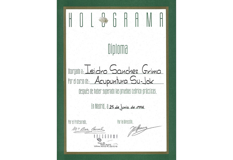 • Especialista en Su Jok (Acupuntura Coreana) por la International Su Jok Acupunture Association, en 1996.