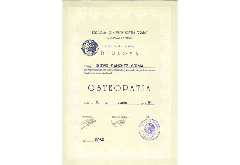 • Diplomado en Osteopatía por la Escuela de Osteopatía “Gaia”, en 1989 – 1992.