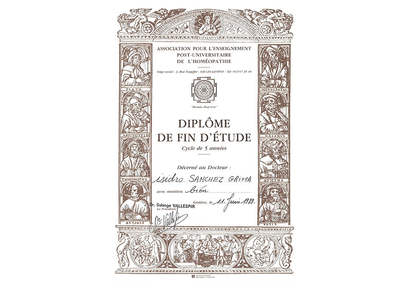 • Homeopatía: “Diplôme de Fin D’Etude de Homéopathie”, por l’Association Postuniversitaires de L’Homéopathie de Genève – Suiza. Desde 1989-1994.