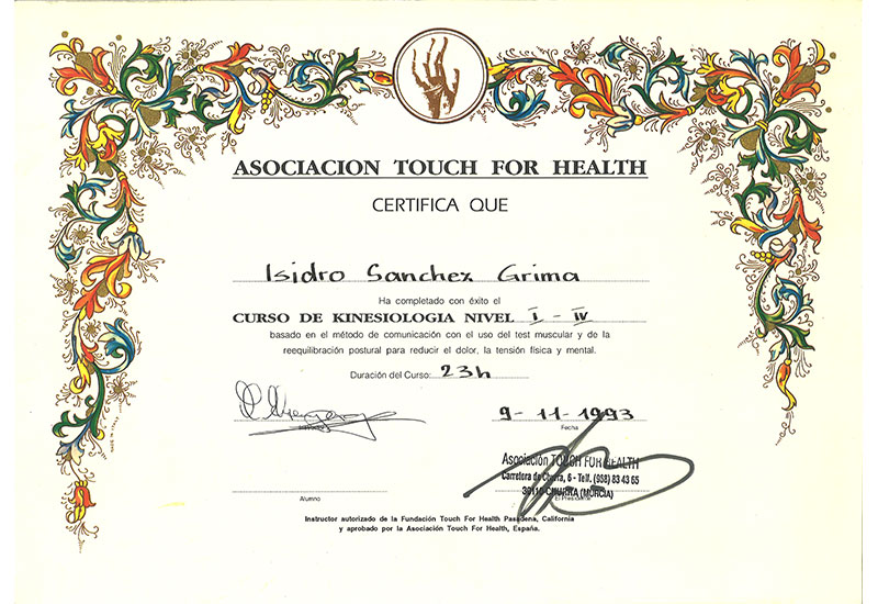 • Especialista en Kinesiología por la Asociación Touch for Health USA ( 4 niveles), en 1992 y 1993.