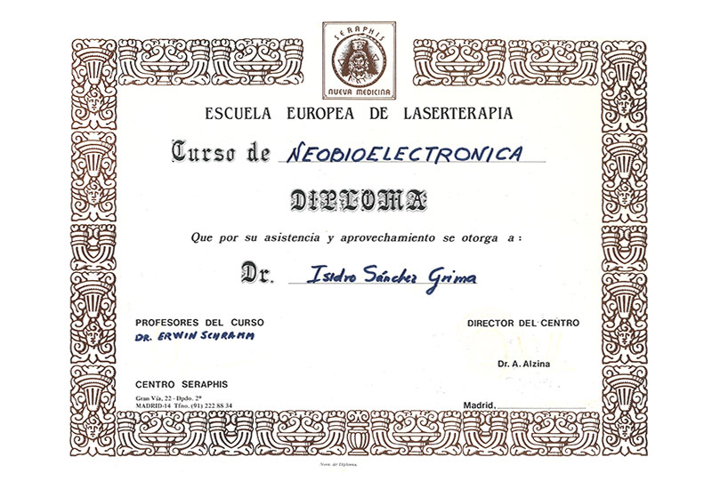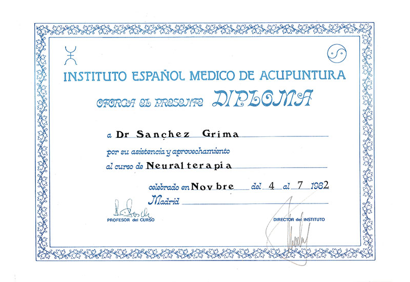 • Especialista en Neuralterapia, según el Dr. Peter Doch (Alemania), en 1987.