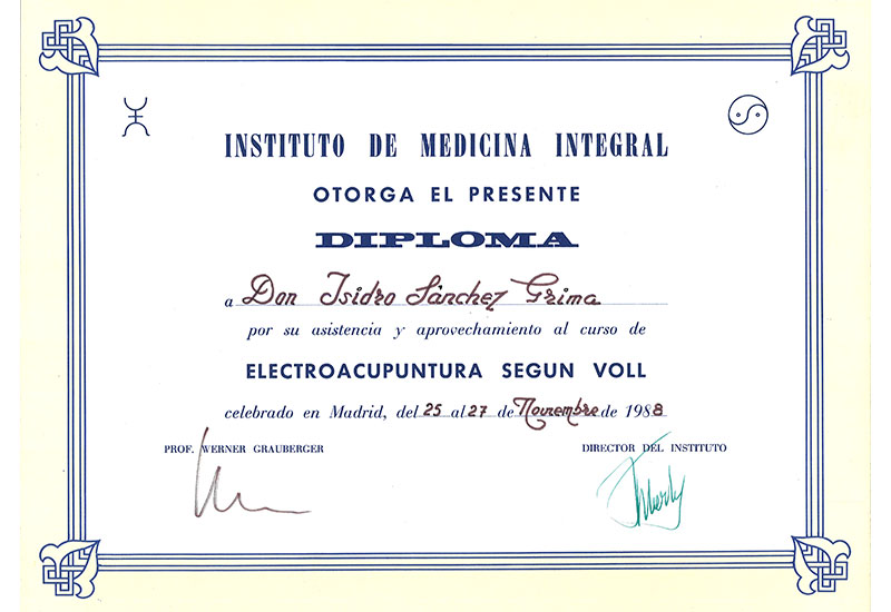 • Diplomado en Electroacupuntura según el Dr. Voll (Alemania), en 1988.
