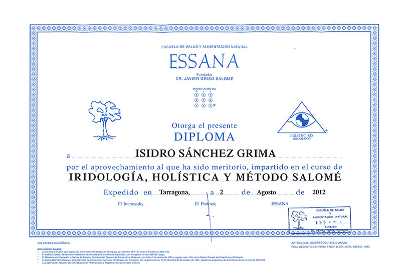 • Diplomado en Iridología Holística y Método Salomé, por Essana, en 1997.