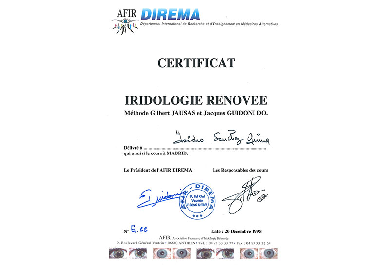 • Formación en Iridologie Renové método Jausas-Guidoni, en 1998.