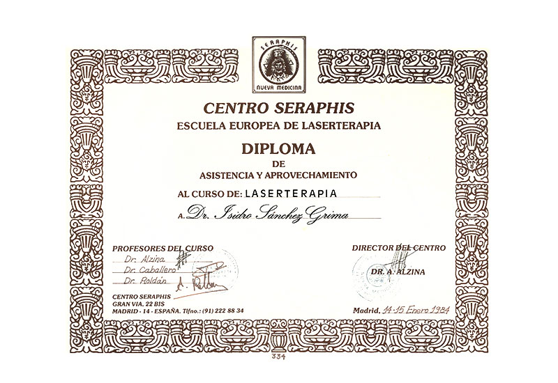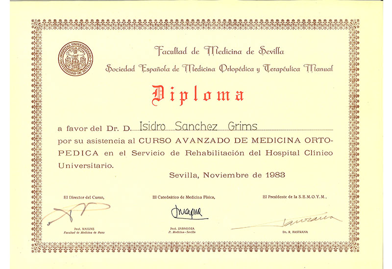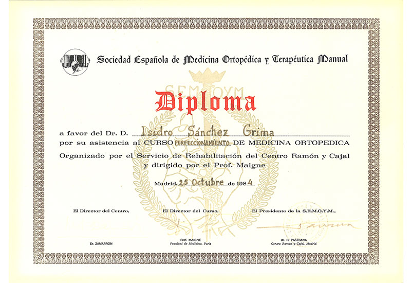 • Diplomado en Medicina Ortopédica – Quiropraxia en el hospital Ramon y Cajal Madrid, en 1983-84.
