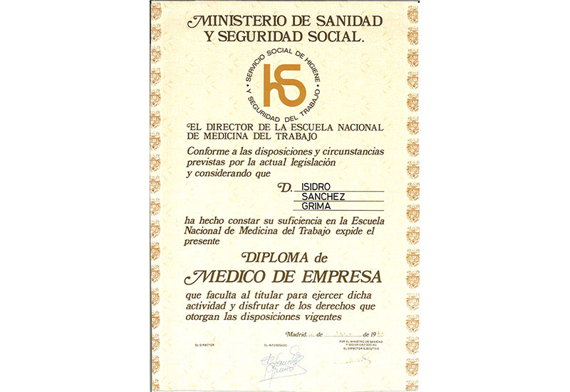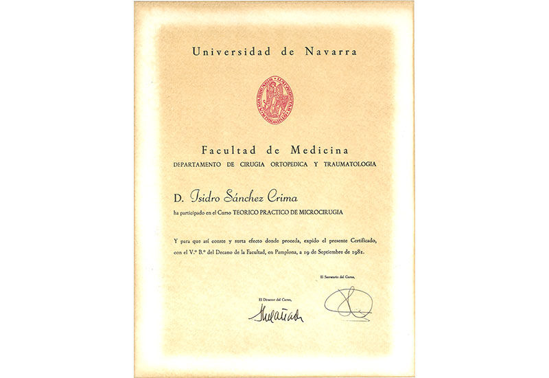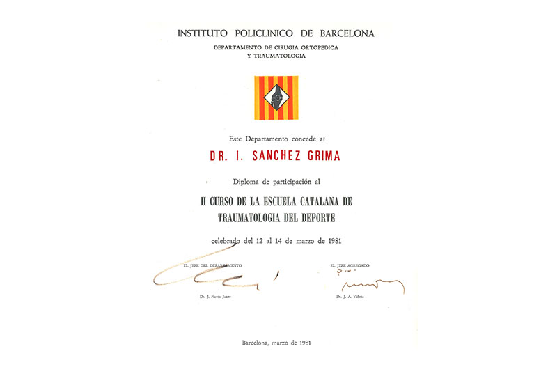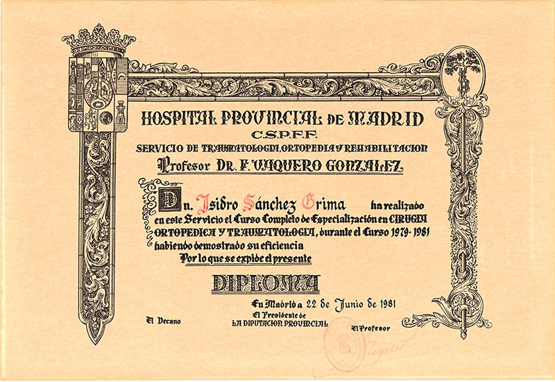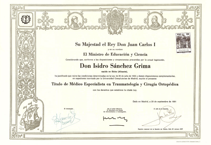 • Título en la Especialidad en Cirugía Traumatológica y Ortopédica por la Universidad Complutense de Madrid, en 1981.