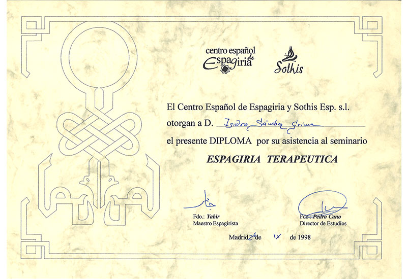 • Diploma de estudios en Espagiria Terapéutica (Alquimia Homeopática), por el Centro Español de Espagiria Sothis, en 1997 y 1998.