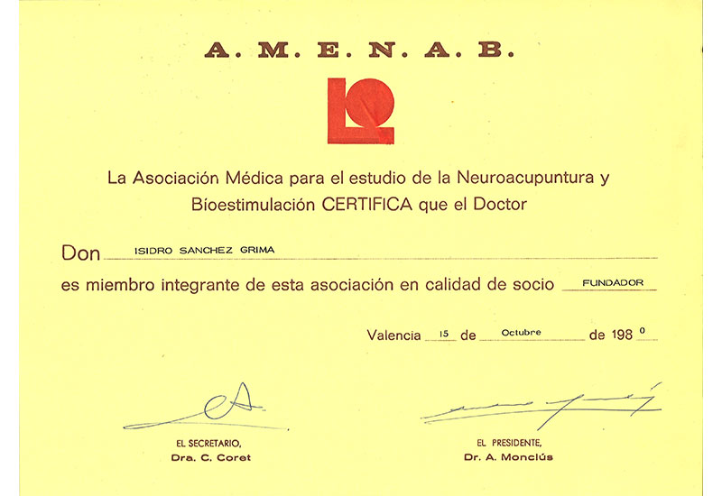• Profesor y Miembro fundador de la Asociación Médica de Neuroacupuntura y Bioestimulación, en el Colegio de Médicos de Madrid, en 1980-84.