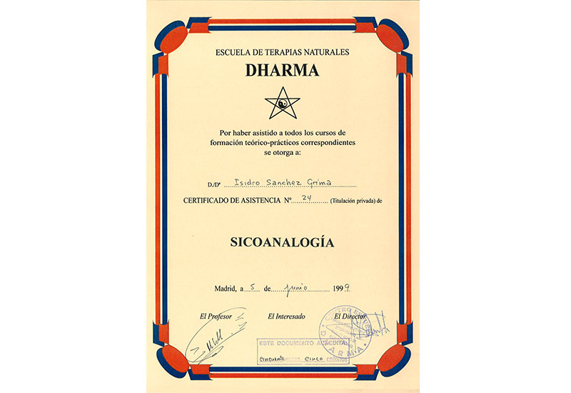 • Curso académico de la Formación en Sicoanalogia por la Escuela de Terapias Naturales “Dharma” de Madrid, en 1999.